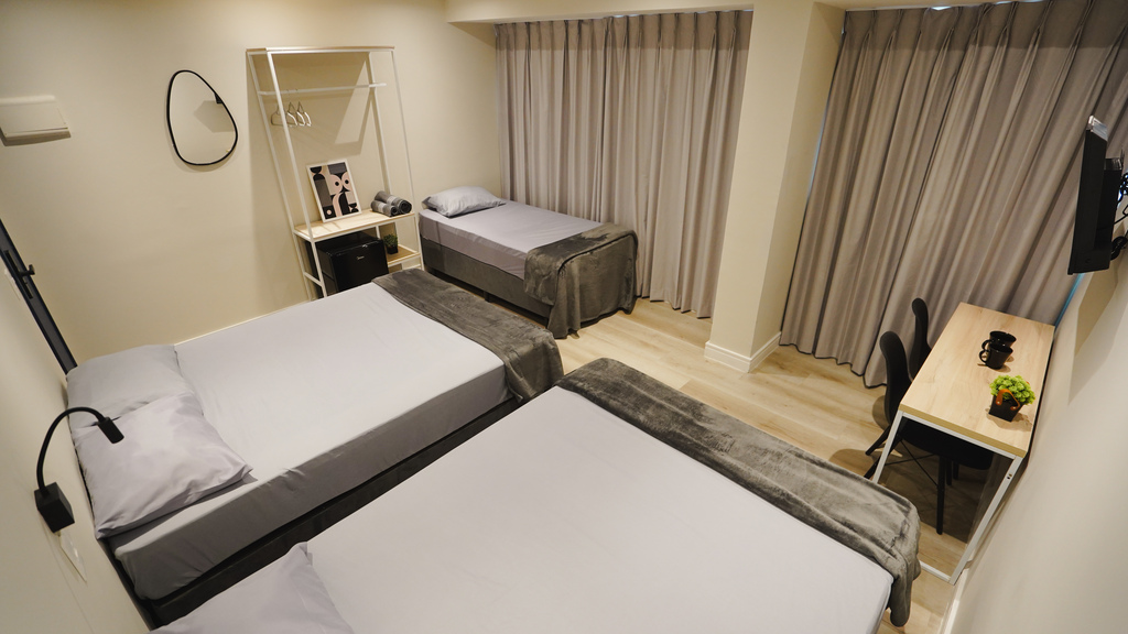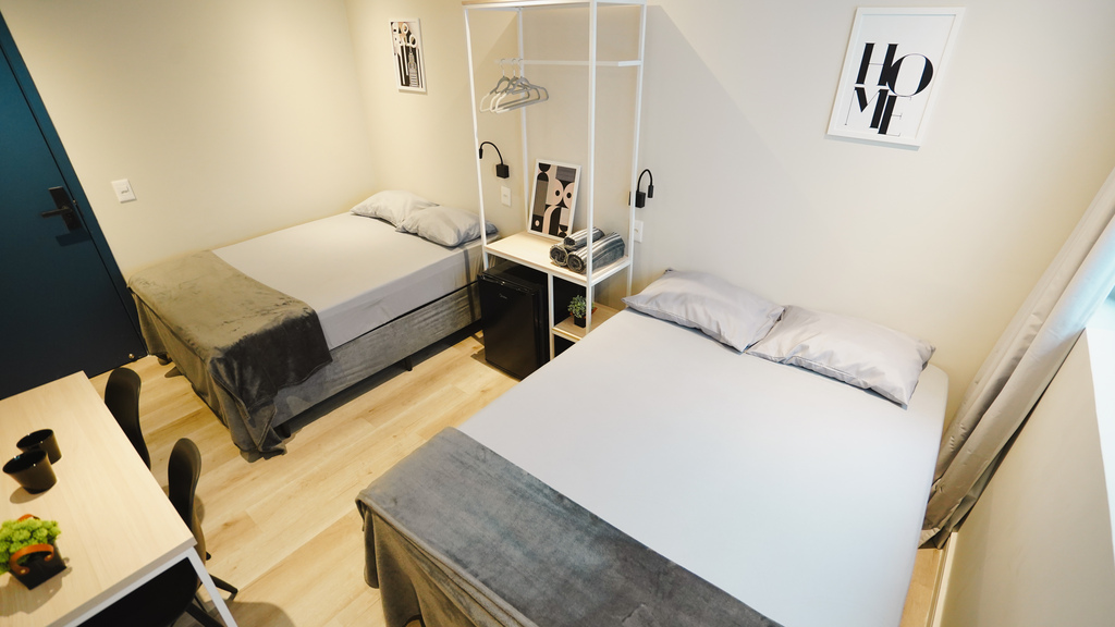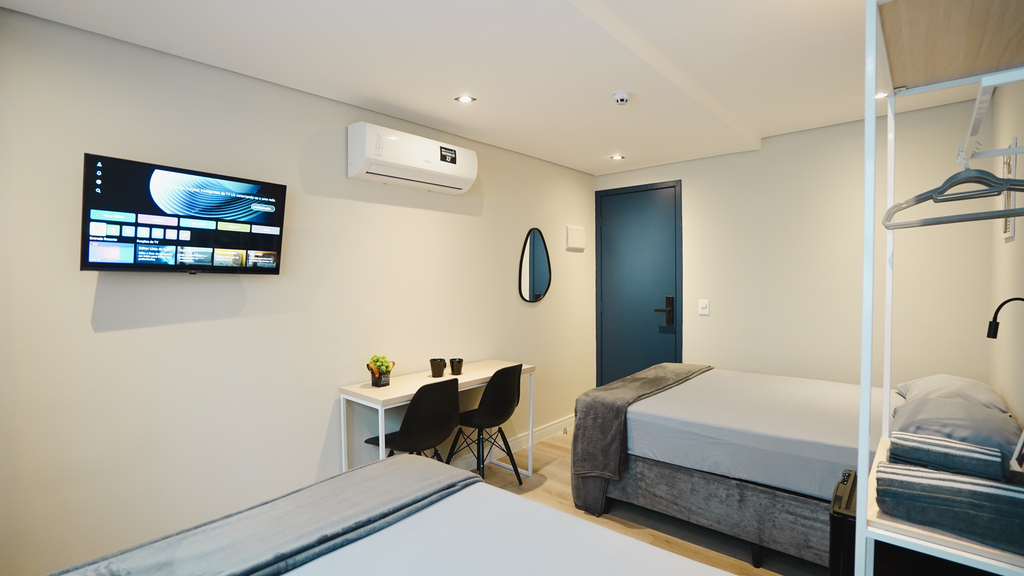 Studio privativo de 14 m² • acomoda 5 pessoas • 2 camas de casal e 1 cama de solteiro